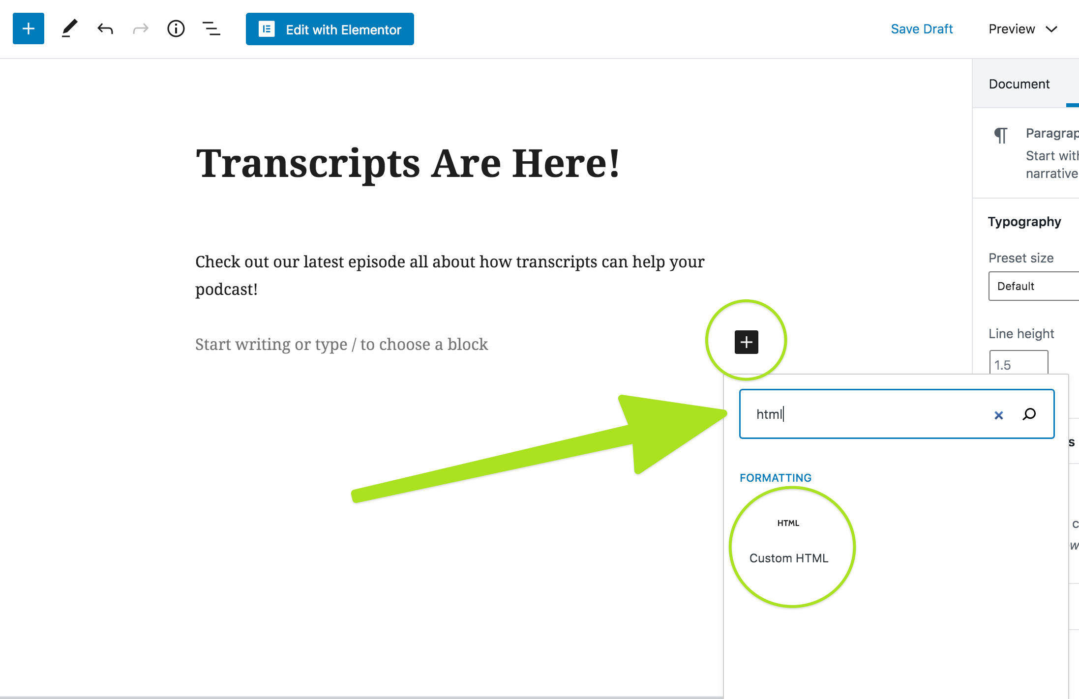 Next, log into your WordPress account and go to the post where you want the player to show. Click the page to add a new block to your post. Search for the