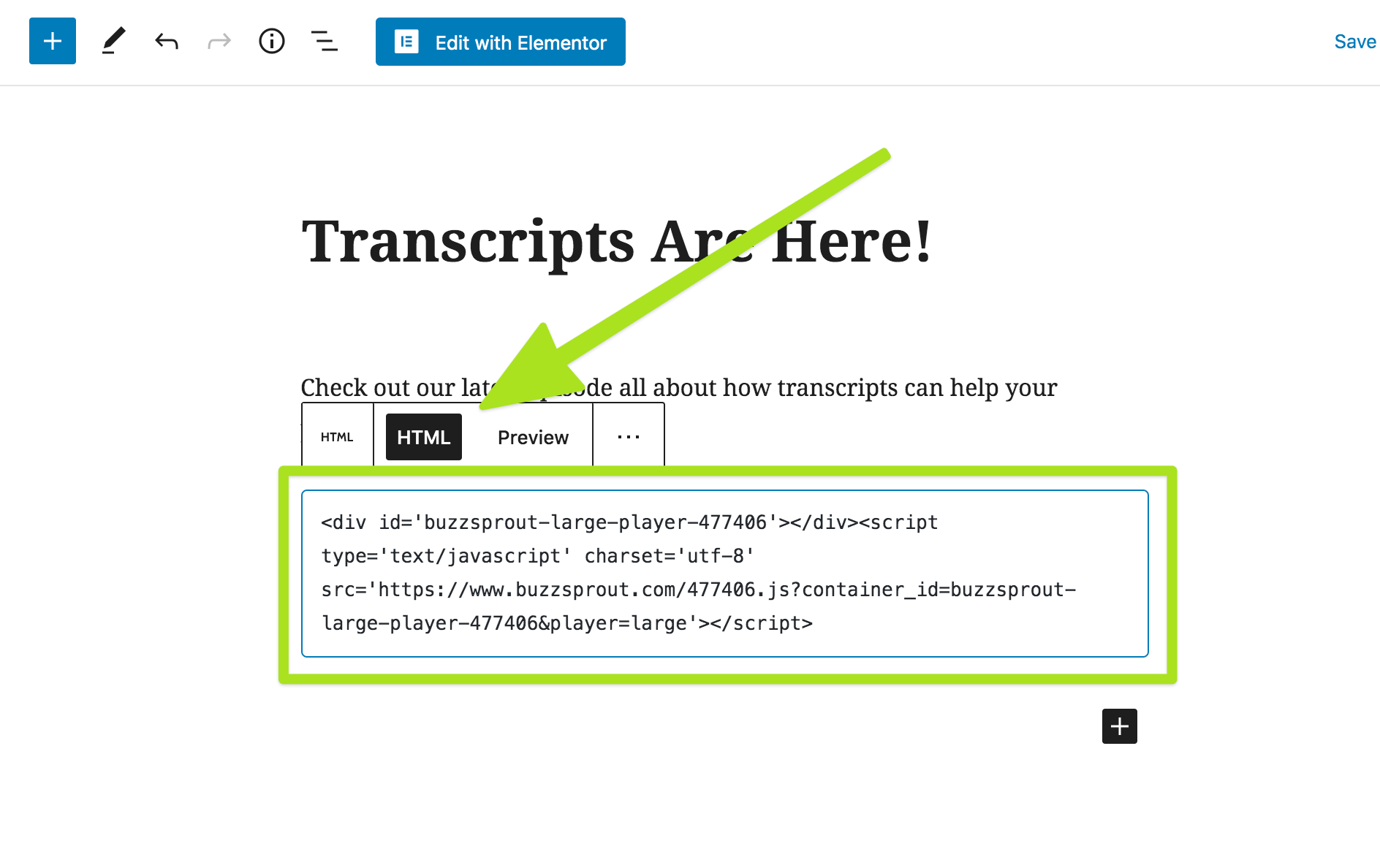 HTML view of the block paste in your Buzzsprout embed code.