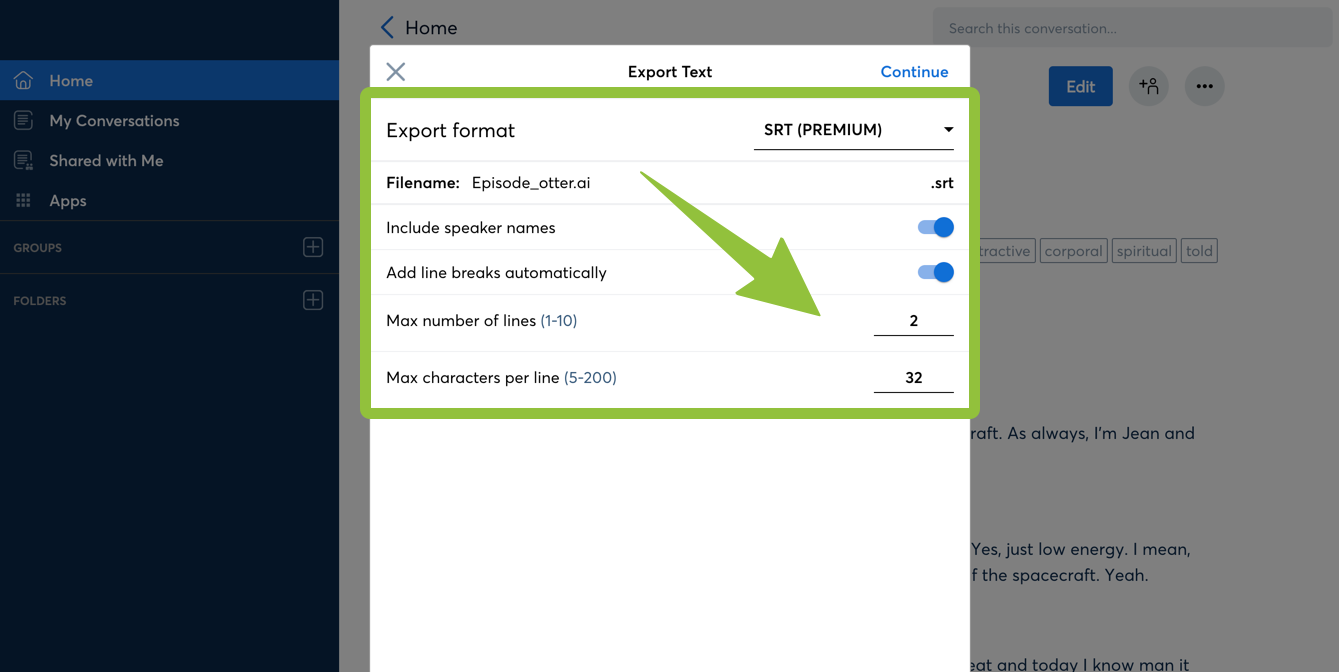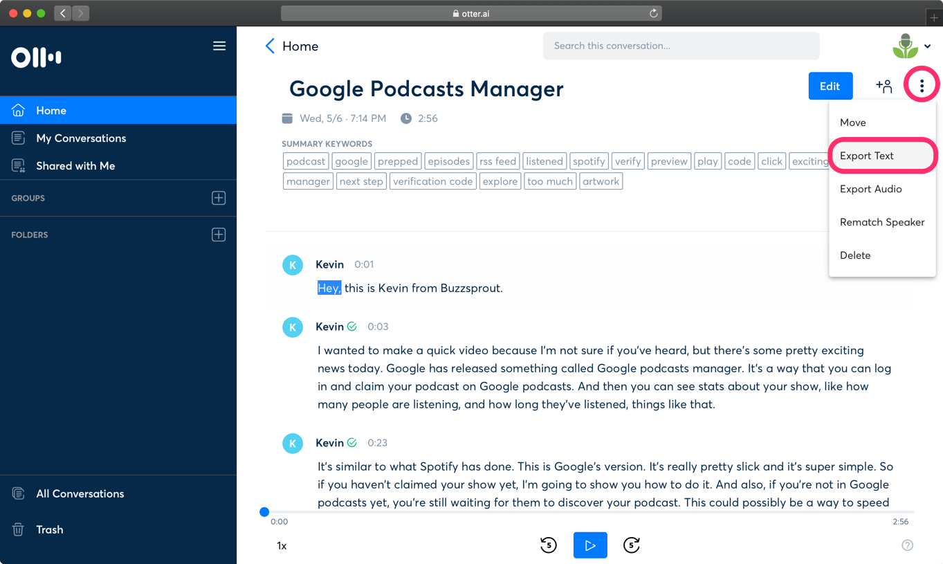 If you create a transcript file through Otter.ai, Buzzsprout can import and automatically format the file for you. To do this you just need to export the correct file type.