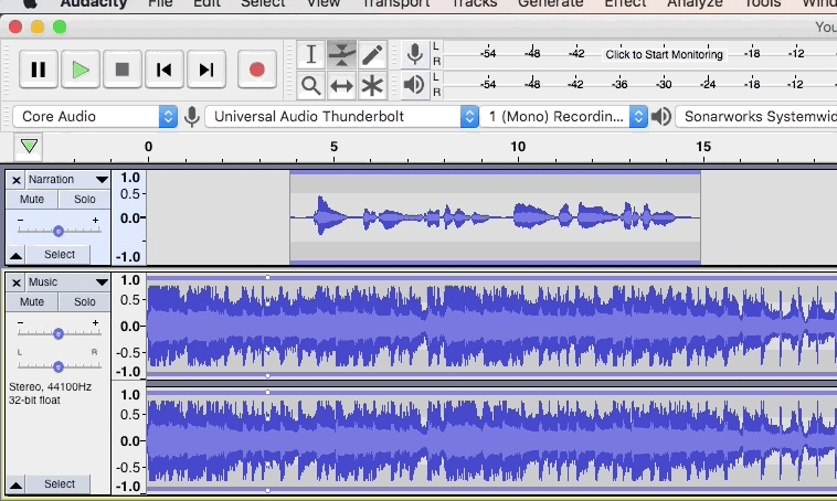 Once you've edited your recorded and imported content to your liking, you'll need to arrange and mix your audio tracks into a cohesive episode. There is no uniform way to do this, but it's generally a best practice not to put multiple types of audio on the same track. Music, sound effects, and each voice, for example, should be kept on their own tracks.