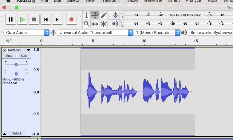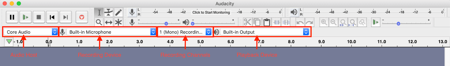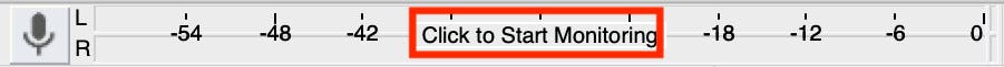 The final step before you begin recording is to test your microphone. With your Recording Device selected, reference the microphone meter and, if necessary, select the 'Click to Start Monitoring' button.