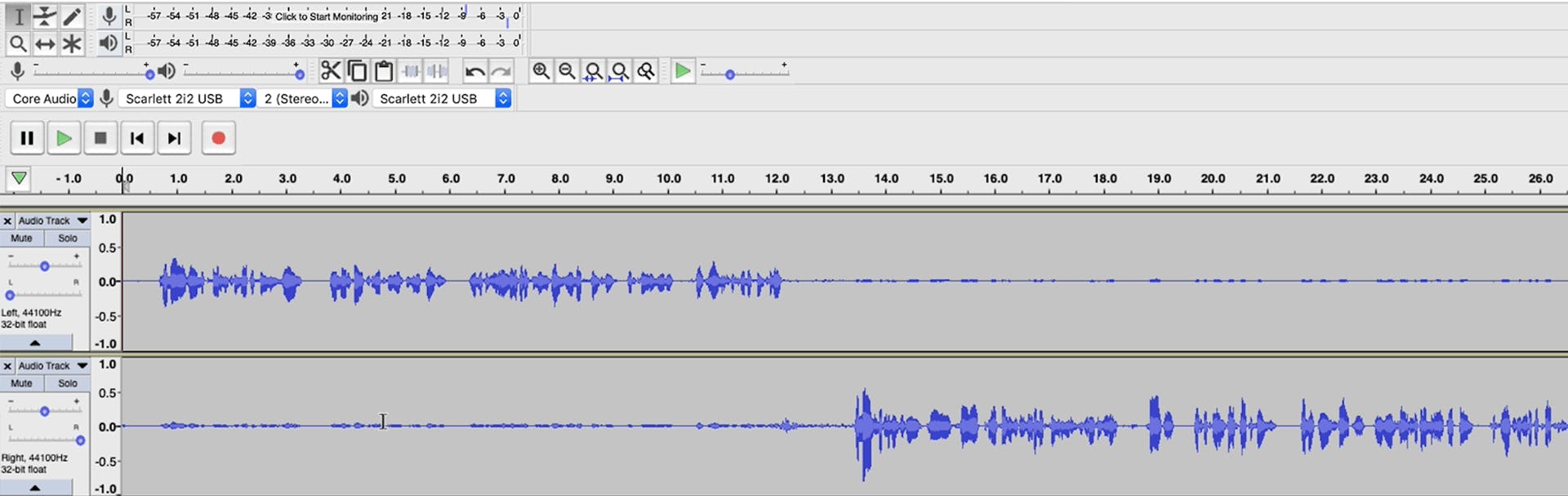 If you're recording two microphones at once, like we're doing here with the Scarlett 2i2, you'll select 2 (Stereo) Recording Channels from the recording channels toolbar. This will record both channels into a single stereo file, with input 1 on the left channel and input 2 on the right channel.