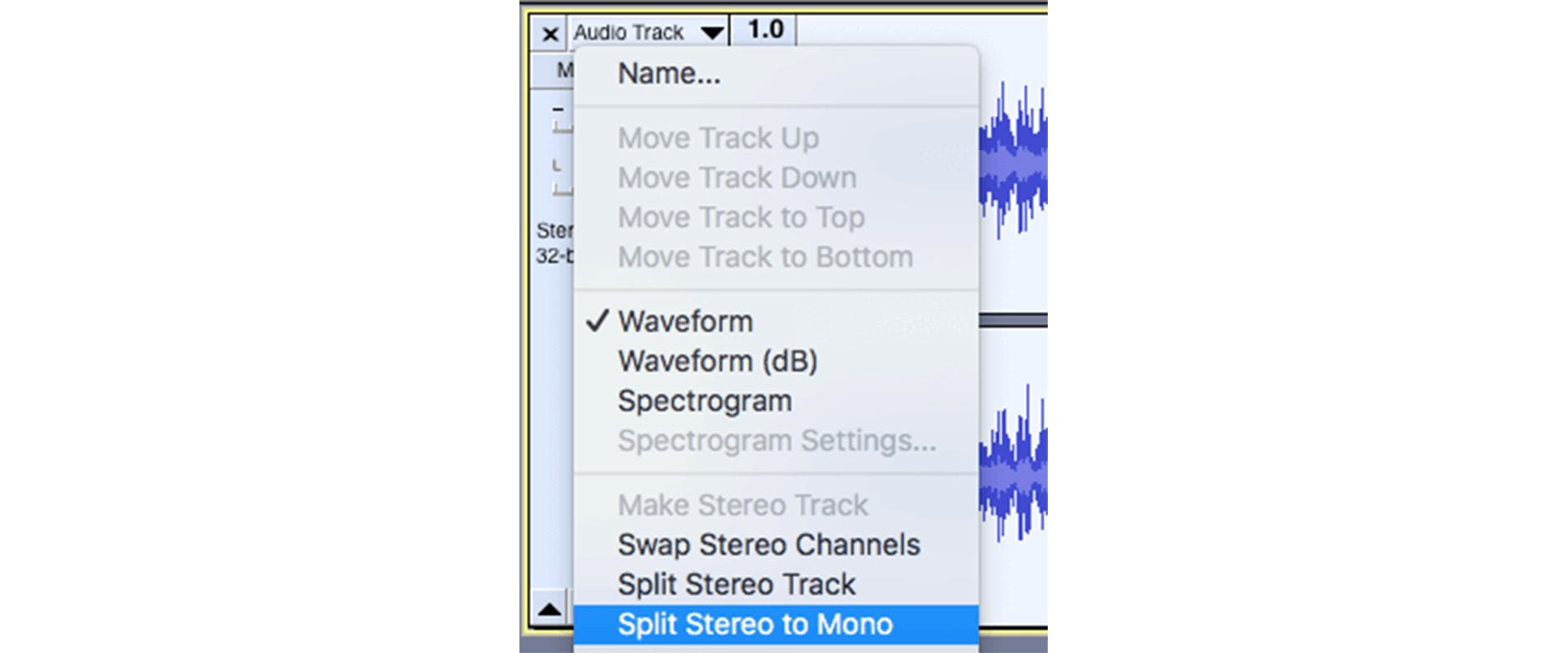 Once you're finished recording, you'll need to split the stereo file into a pair of mono files for editing and mixdown. Click the down arrow next to the track name and select "Split Stereo to Mono." Each resulting file will now be on its own track.