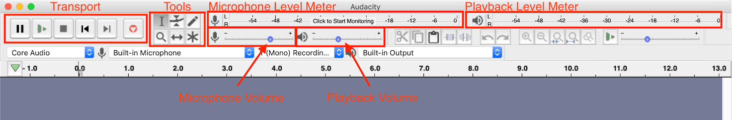 Audacity is available for both Windows and Mac devices, so to start, download Audacity onto whatever device you’re using! When you first open Audacity you'll see a set of toolbars at the top, including Transport (Play, Stop, etc.), Tools, and Volume/Meters for microphone input and playback.