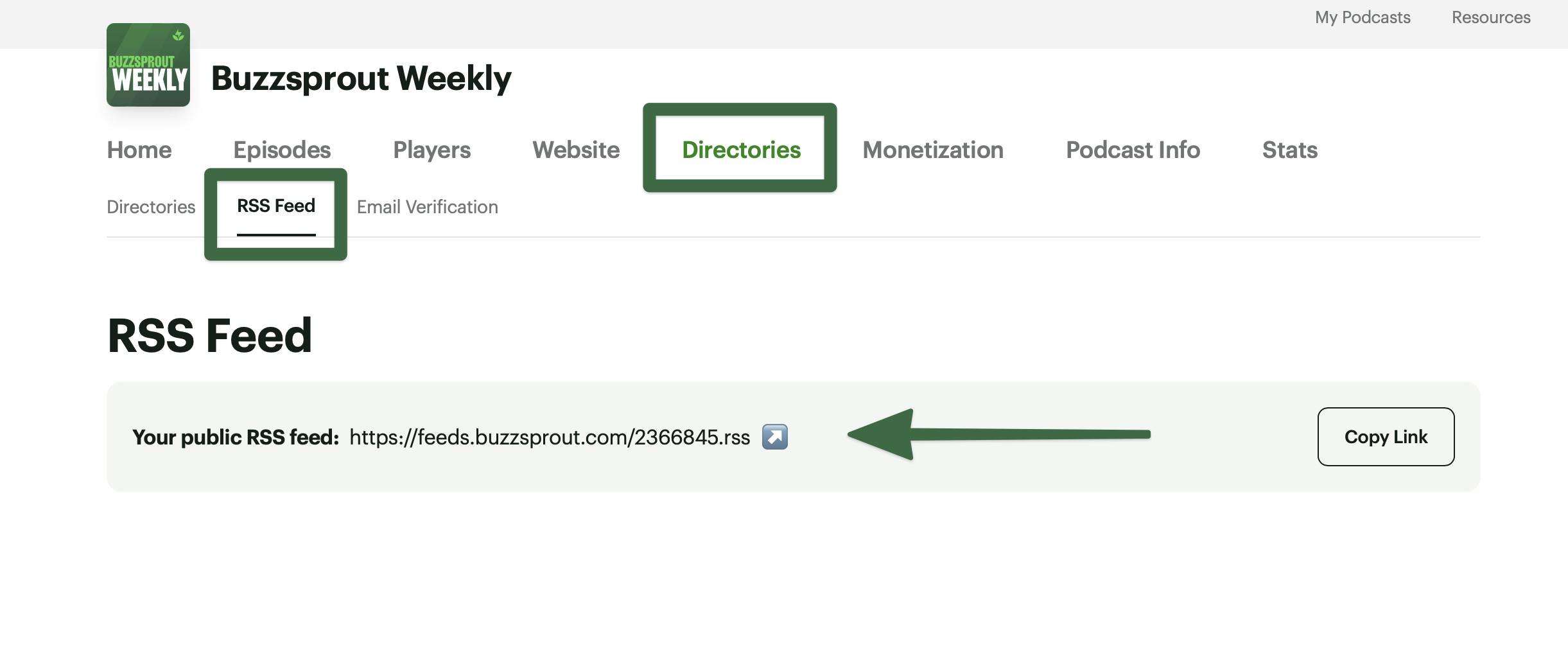 If you’re using Buzzsprout, simply go to the Directories > RSS Feed tab in your dashboard. If you’re with a different hosting platform, check their help guides for instructions on finding your RSS feed URL.