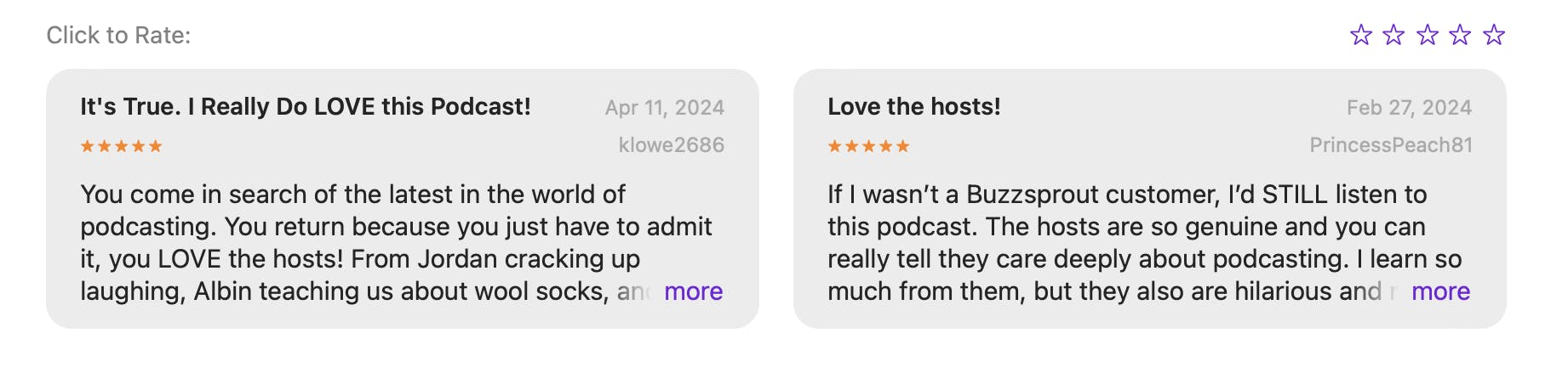 The purpose behind reviews is simple: humans like to know someone else has tried something first and that they vouch for it. It's the same reason you scroll down to read Amazon customer reviews before purchasing a product. Essentially, reviews are social proof for potential listeners!