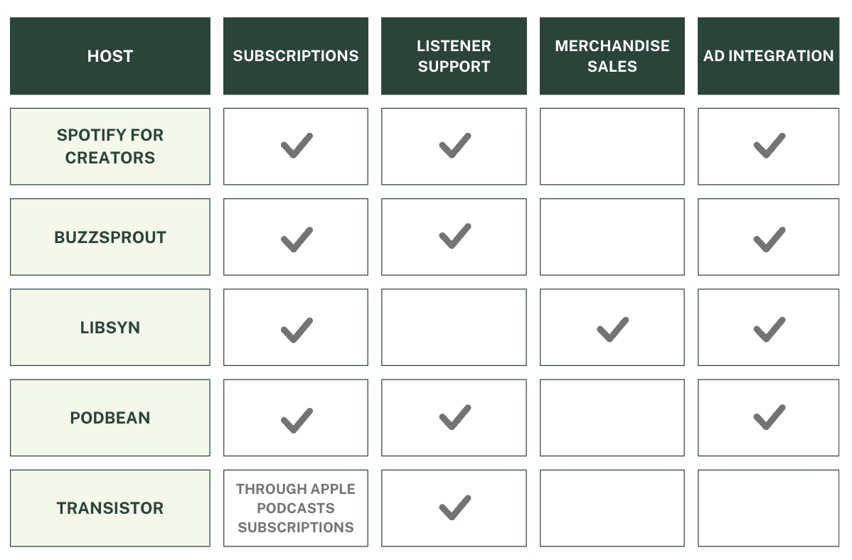 The best hosts for monetizing your podcast are Buzzsprout and Libsyn