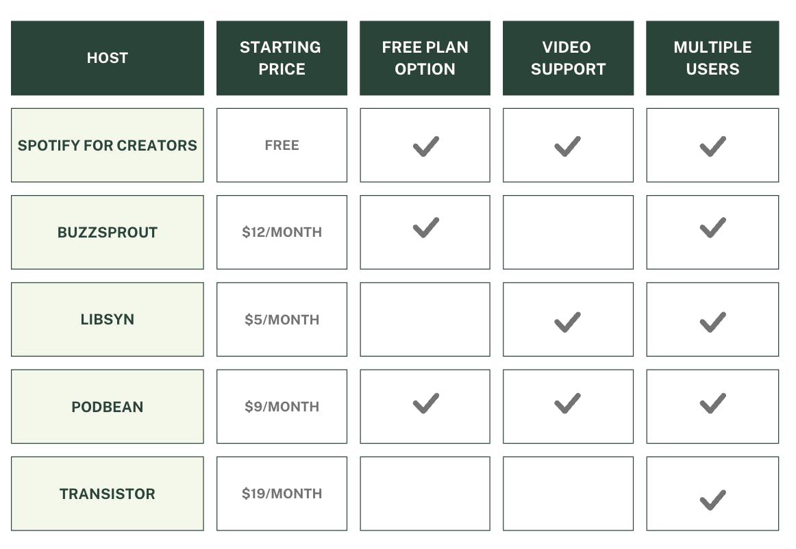 - Spotify for Creators: Because Spotify for Creators only has one plan, all podcast hosting is free and includes the same features.