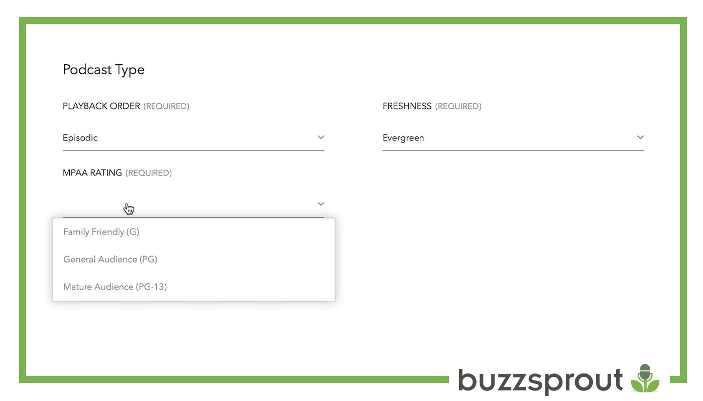 The MPAA Rating field is Pandora's version of "Clean" or "Explicit" in Apple Podcasts. Here's a general rule of thumb for what to choose for your podcast: