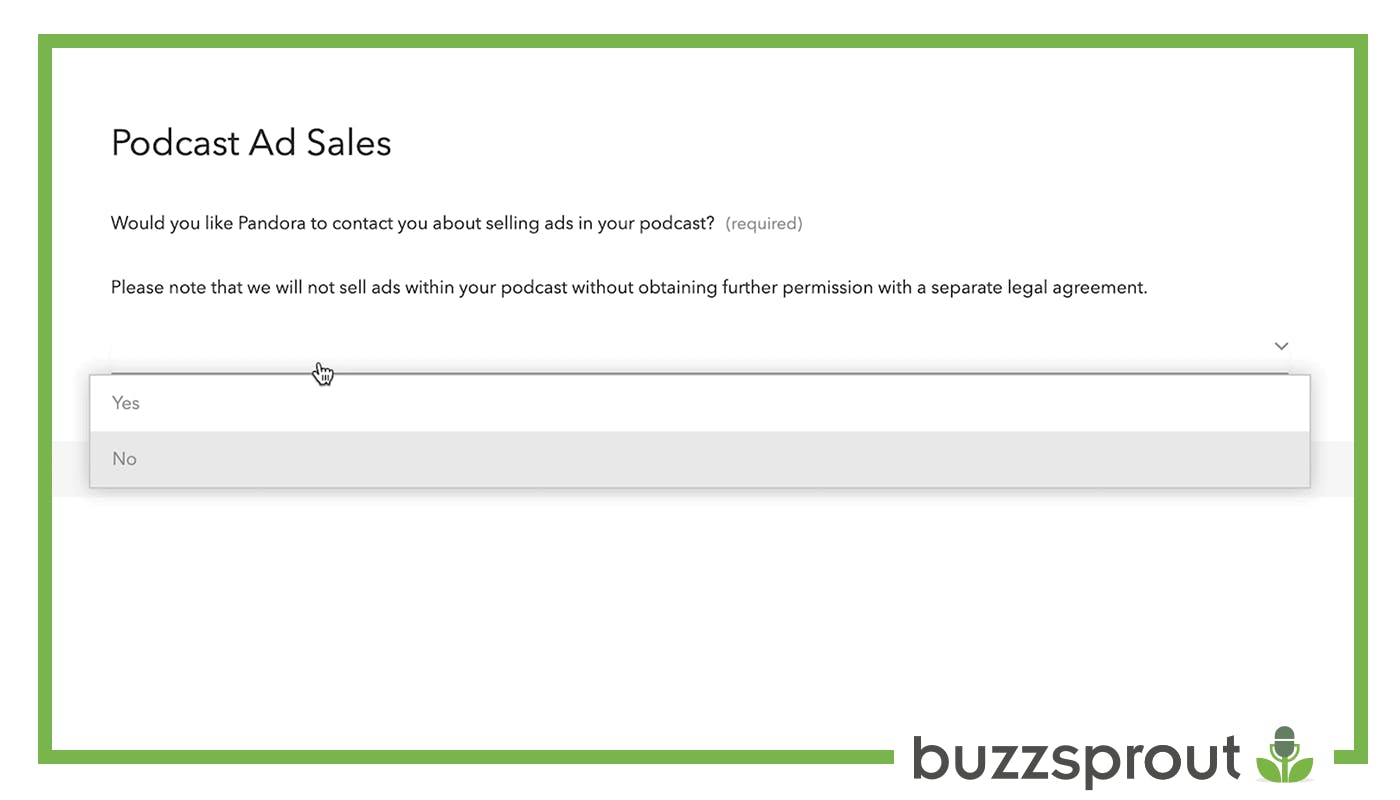 Note that saying "yes" does not ensure that Pandora will run ads and give you a cut. It just means you'd be open to it if Pandora decides your podcast is a good fit for their ad platform and its advertisers.
