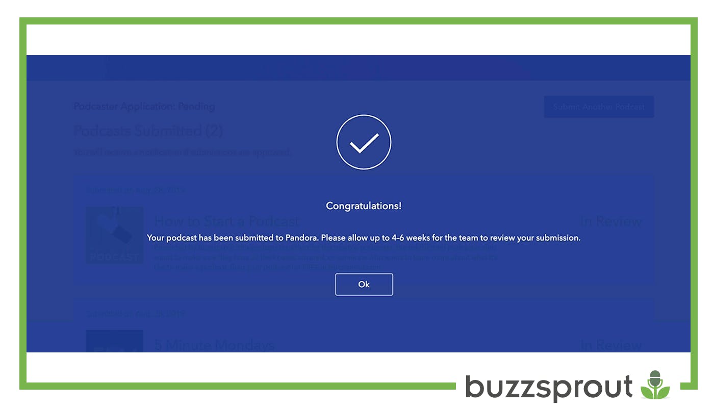 Once you've successfully submitted your podcast to Pandora, you can see the status of your submission. Pandora will contact you via email if your podcast is approved.